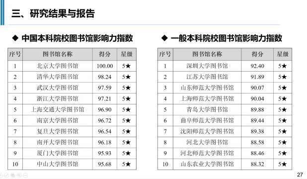 该报告覆盖普通高校图书馆2919家,包括1365所本科院校图书馆和1554所高职(专科)院校图书馆,公共图书馆1980家,各类型专业图书馆390家。在本科院校图书馆影响力指数排行榜中,北京大学、清华大学、武汉大学图书馆位列前三名;在一般本科院校图书馆影响力指数排行榜中,深圳大学、江苏大学、山东师范大学图书馆位列前三名。报告还对民办本科院校和高职高专院校图书馆进行了评价。