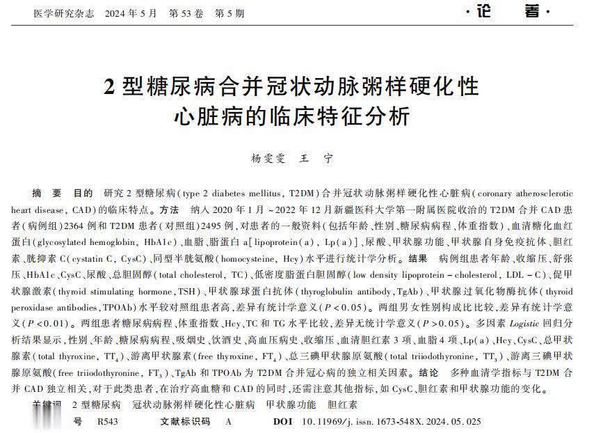 参考资料[1]杨雯雯.2型糖尿病合并冠状动脉粥样硬化性心脏病的临床特征分析,医学研究杂志,2024-05-15